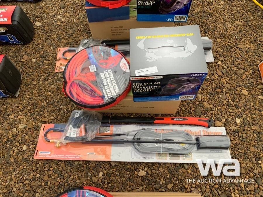 25 FT BOOSTER CABLES, AUTO DARKENING WELDING HELMET, TIGER TORCH, AXE, 3/8" X 50 FT. AIR HOSE