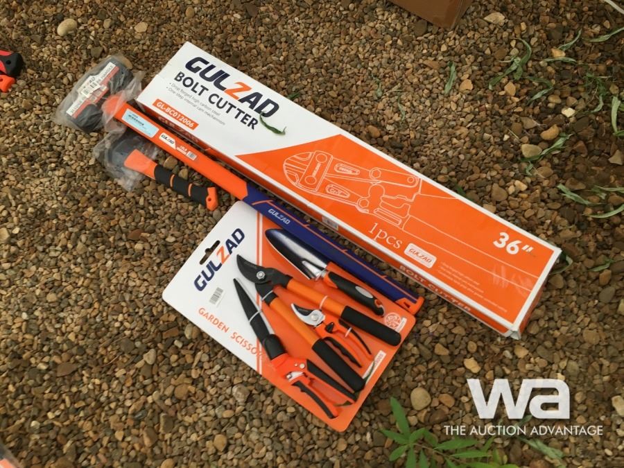 12" HATCHET, 36" BOLT CUTTERS, 4 PIECE GARDEN TOOLS (UNUSED)