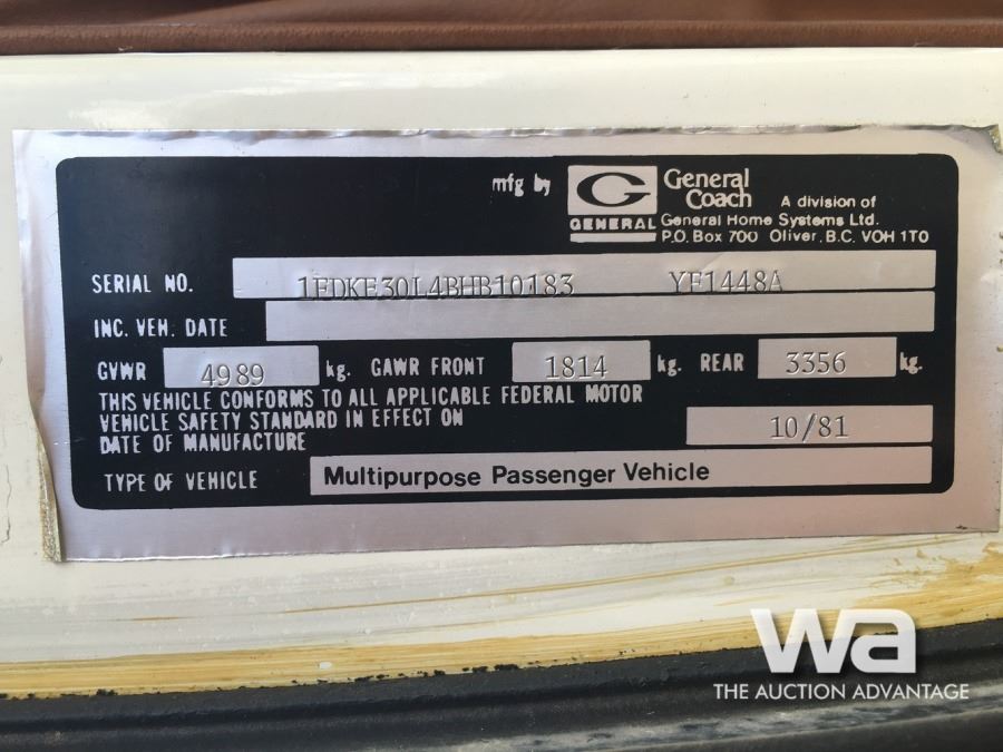 ODOMETER: 19,363 KM SHOWING CREAM, GAS, FRIDGE, STOVE, OVEN, PROPANE FURNACE, SHOWER, BATHROOM, DOUBLE BED, SLEEPS (6) PERSONS VIN: 1FDKE30L4BHB10183