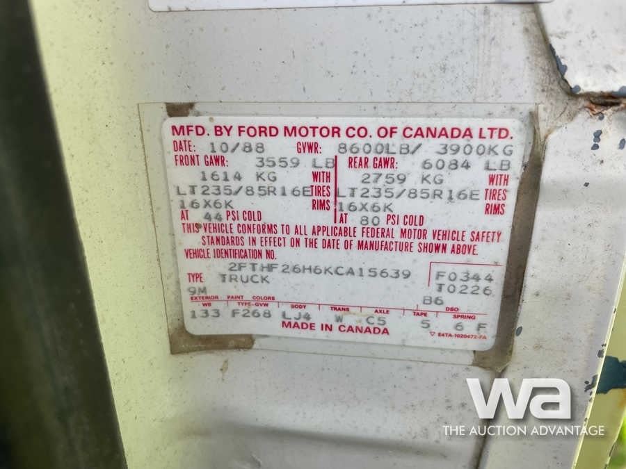 Odometer: 225,742 KM Engine: GAS Transmission: 5 SPD Drive Type: 4WD Color: BLUE FUEL TANK WITH 12V PUMP, JOCKEY BOX VIN: 2FTHF26H6KCA15639 *AB REGISTERED *Repair Manual in Weaver Trailer
