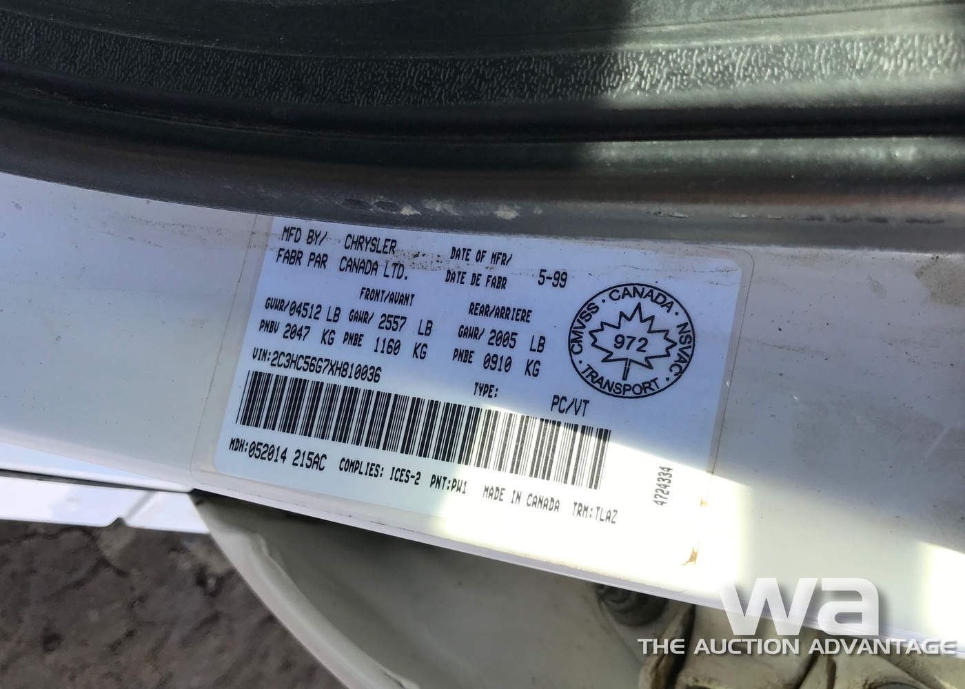WHITE, 4-DOOR, AUTO, *NEEDS BATTERY, ODOMETER: 230,458KM, VIN:2C3HC56G7XH810036, *BC REGISTERED