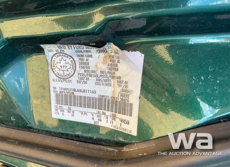 ODOMETER: 279,250 KM ENGINE: GAS TRANSMISSION: AUTOMATIC DRIVE TYPE: 4WD COLOR: GREEN VIN: 1FMPU18L6XLB11163 *AB REGISTERED *KEYS:_____*
