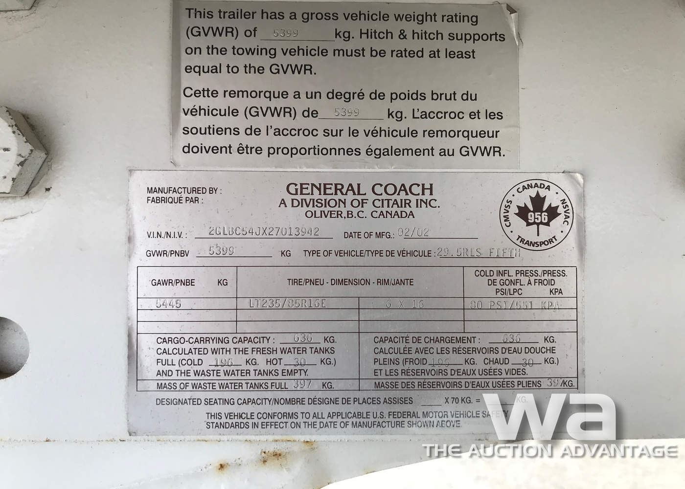 WHITE, 29.5 FT., 5TH WHEEL, AWNING, A/C, 1-SLIDE, VIN:2GLBC54JX27013942, *AB REGISTERED, *MANUAL