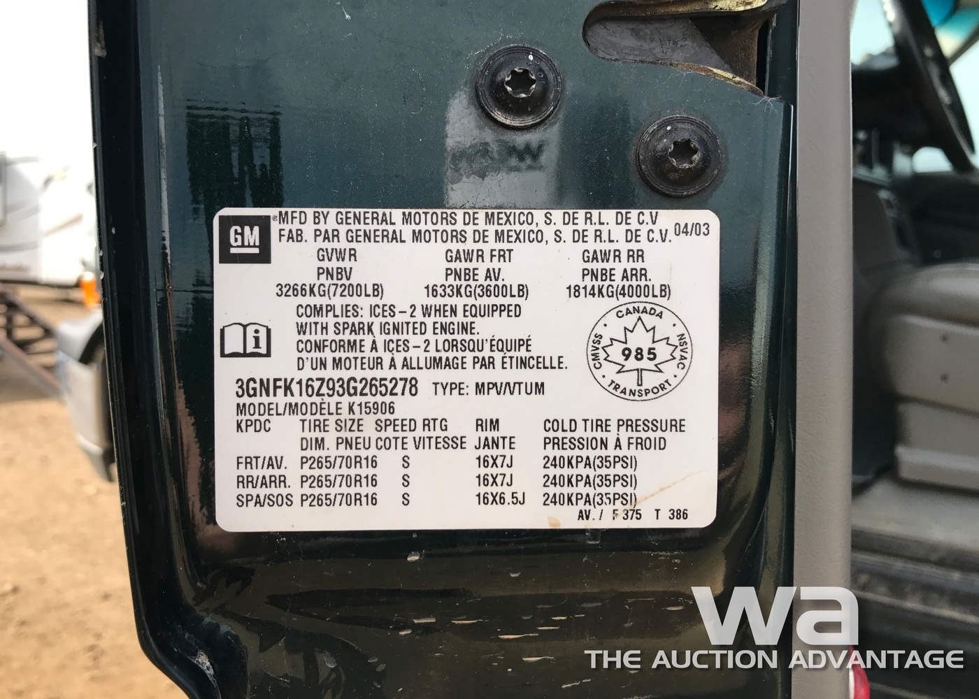 DARK GREEN, AUTO, GAS, 331,325 KM, VIN:3GNFK16Z93G265278, *AB REGISTERED