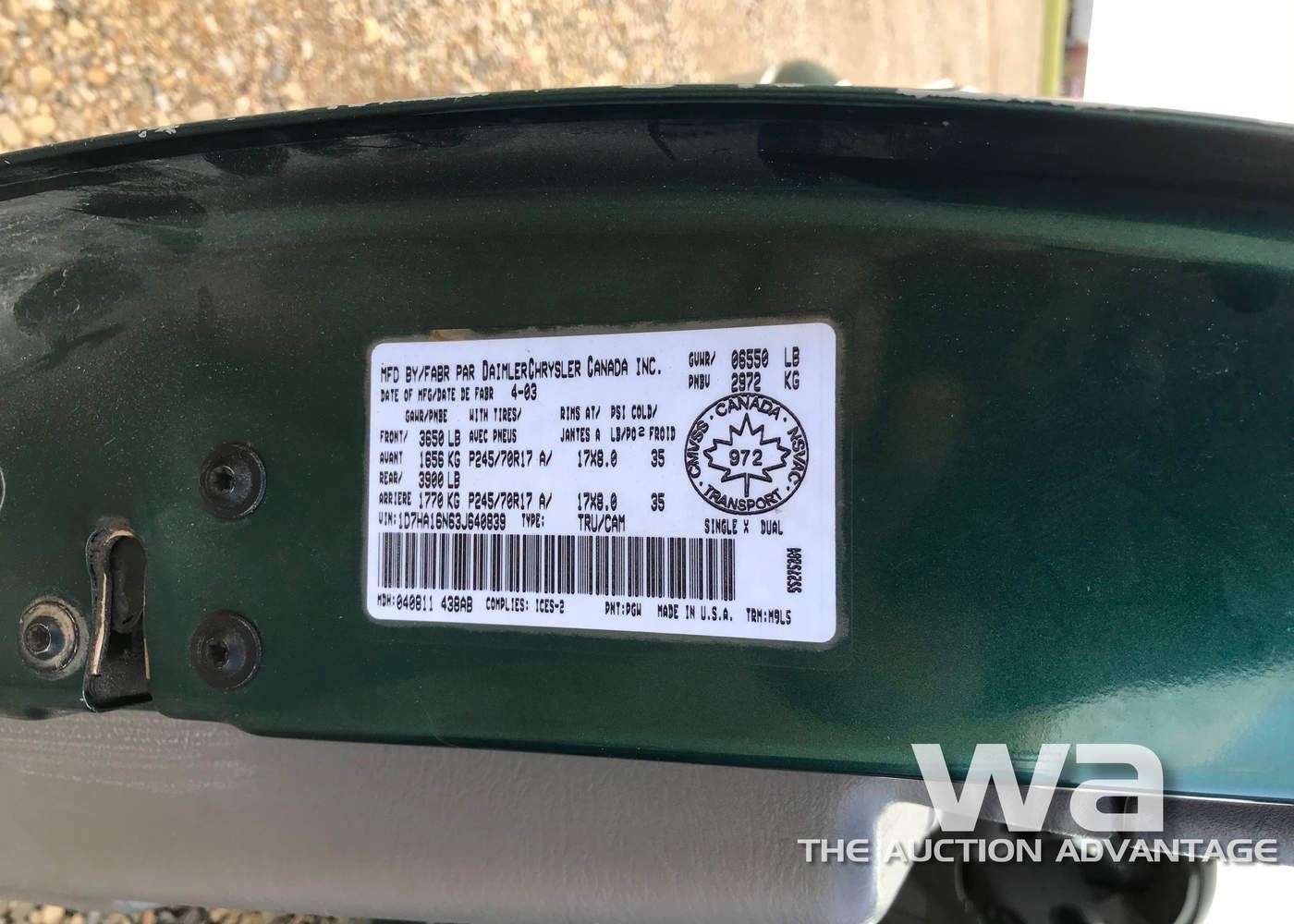 GREEN, 2WD, GAS, AUTO, ODOMETER: 324,128 KM, VIN:1D7HA16N63J640839, *AB REGISTERED