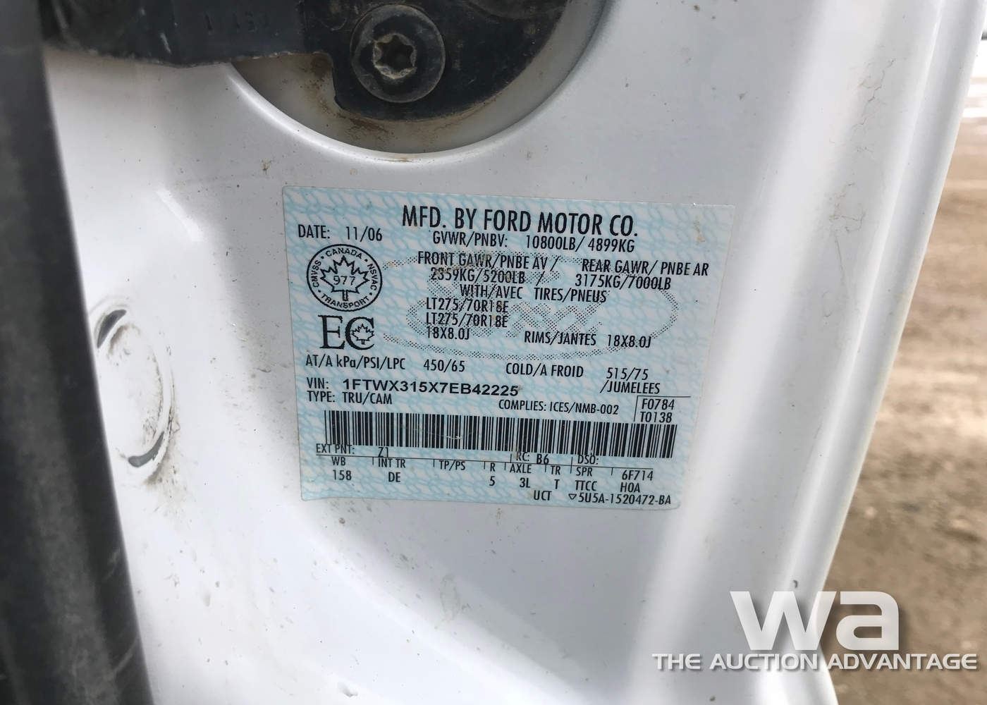 WHITE, GAS, 4WD, AUTO, ODOMETER: 288,000KM, VIN:1FTWX315X7EB42225, *AB REGISTERED