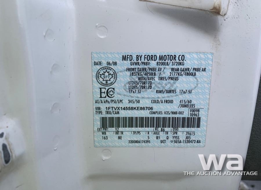 ODOMETER: 232,203 KM, GAS, AUTOMATIC, 4WD, WHITE, LONG BOX, NEW WINDSHIELD, TIRES, REAR BRAKES VIN:1FTVX14558KE86706, *AB REGISTERED