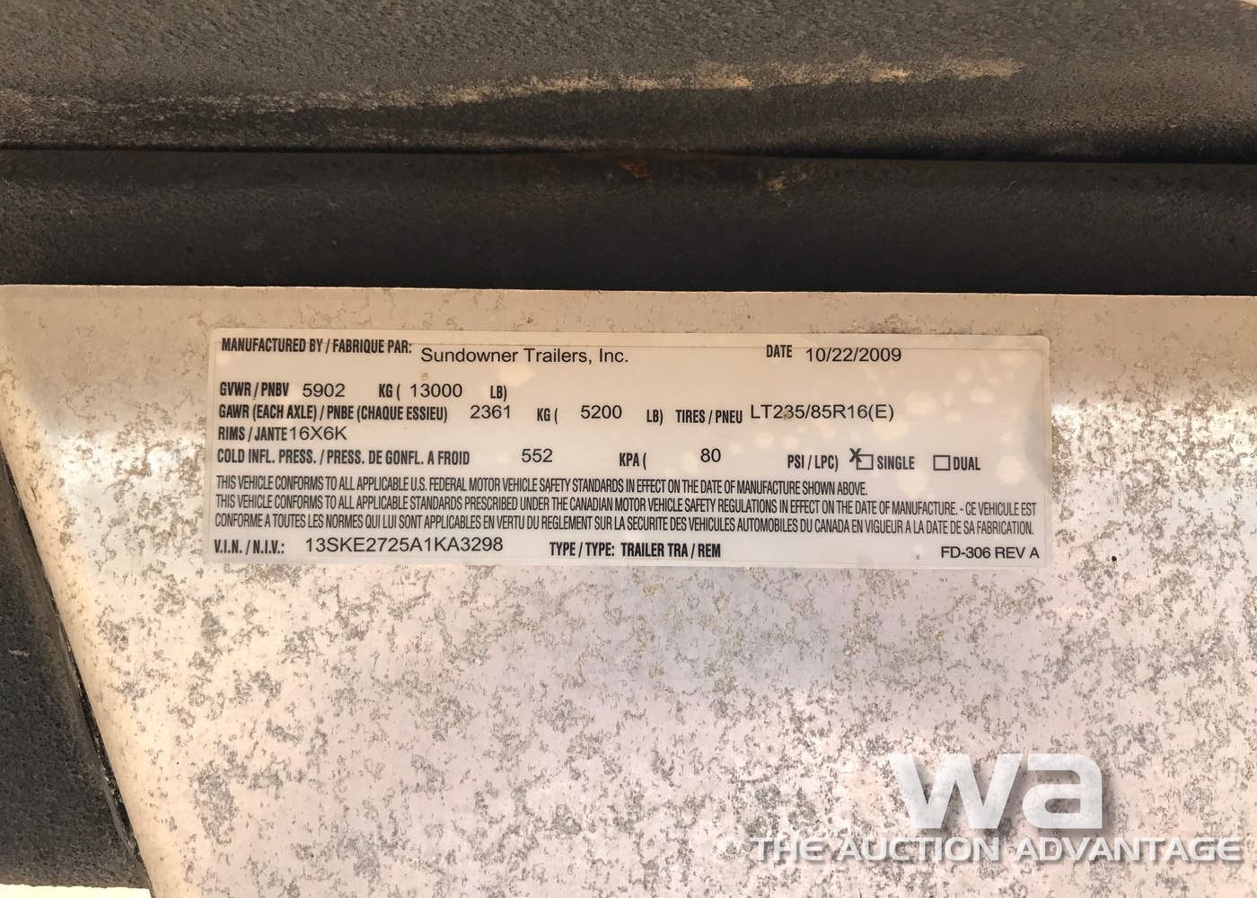 WHITE, ALUMINUM, TACK ROOM, T/A, LT235/85R16 TIRES, VIN:13SKE2725A1KA3298, *AB REGISTERED