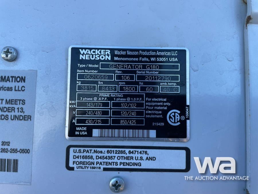 2012 Wacker Neuson G180 Generator with T/A Trailer