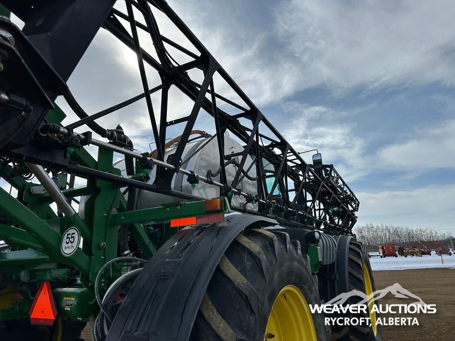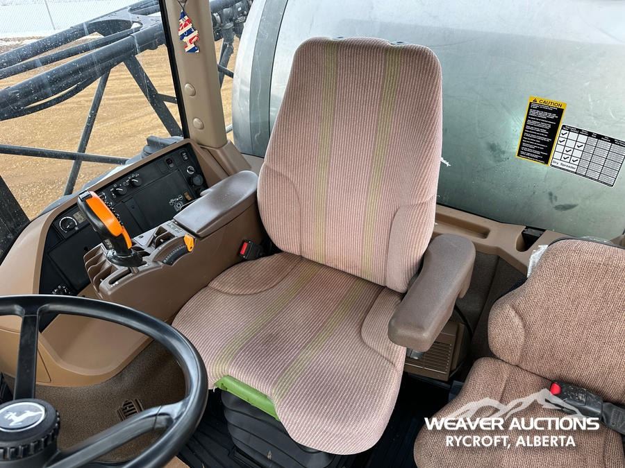 Specifications: AIR CONDITIONER, AIR RIDE SEAT, GREENSTAR 3 2630 DISPLAY, STARFIRE 3000 ANTENNA/ RECEIVER, AUTOTRAC SF2 ACTIVATION, SECTION CONTROL, AUTOMATIC BOOM HEIGHT CONTROL, HYDRAULIC DRIVEN PUMP, 1200 GAL STAINLESS STEEL TANK, RINSE TANK, 5 NOZZLE BODIES, 620/70R46 TIRES, HYDRAULIC AXLE ADJUSTMENT