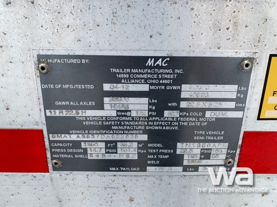 TRA -57 , A/R SUSP, ALUM TANK, ALUM WHEELS, 3 COMP'T, AIR POWERED HAND RAILS, 22.5 RIMS, C/W HOSES & FITTINGS Size: 1350 CUBIC FT. VIN: 5MATA3837DA022628 *AB REGISTERED *CVIC INSPECTION DATE: 2021/03/08 Consignment from: Aaim's Logistics Inc.