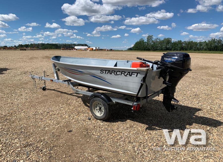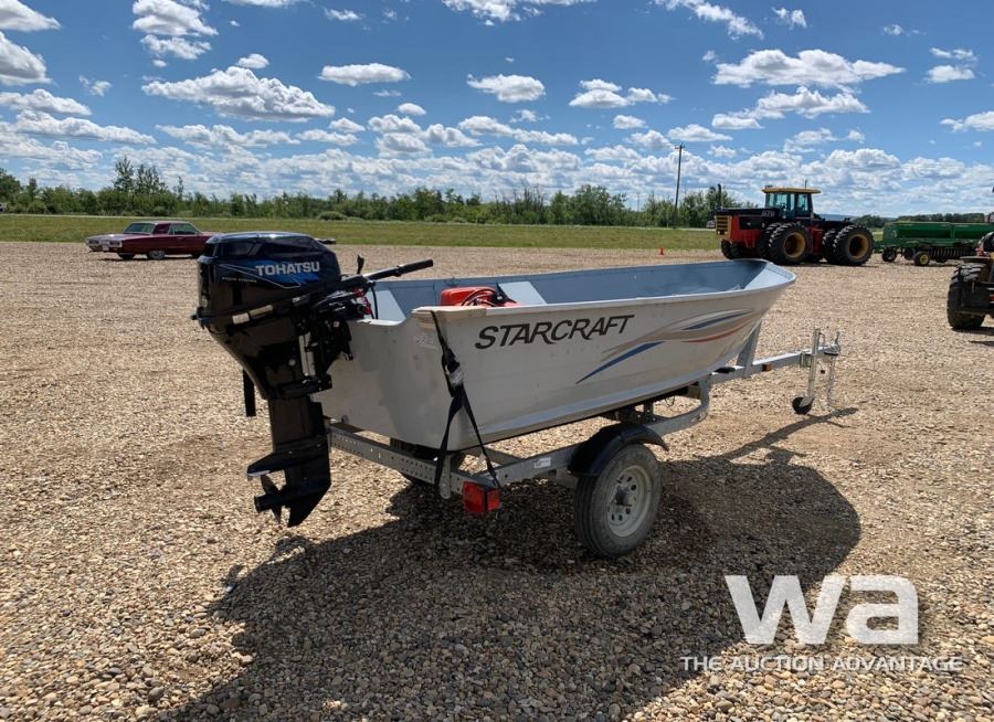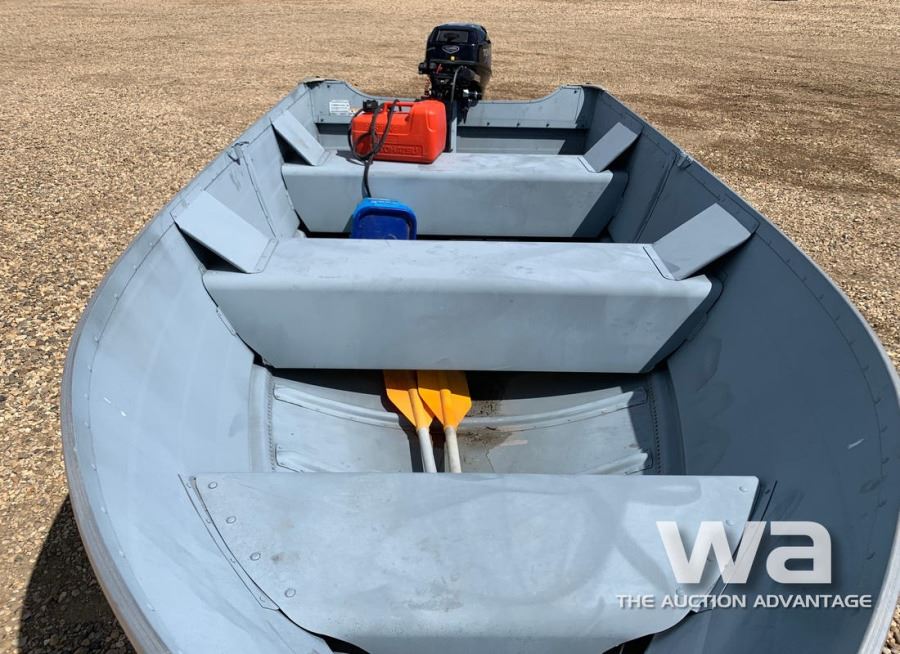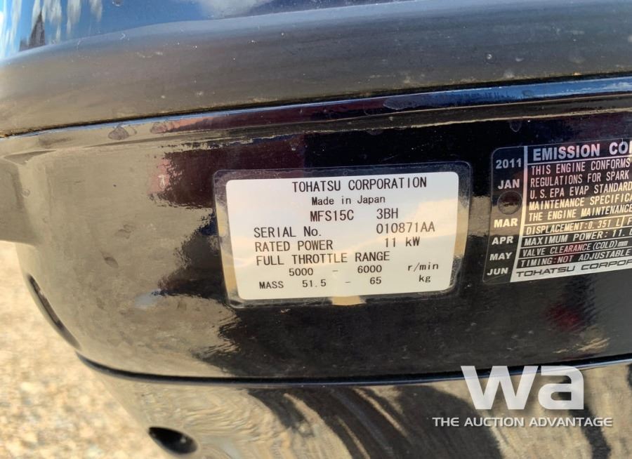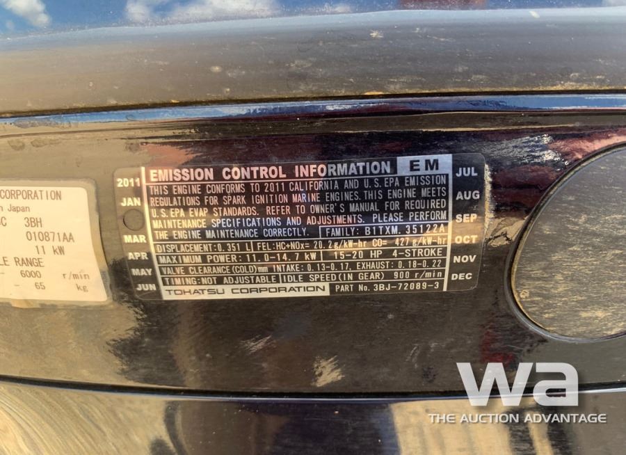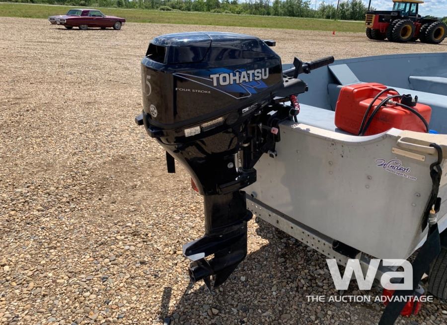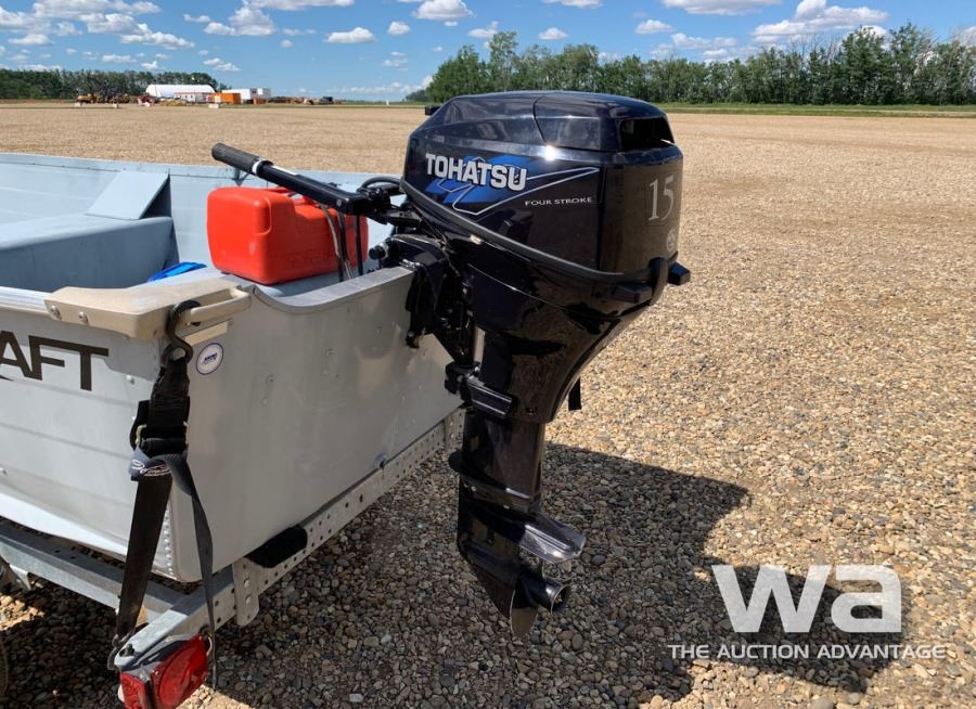 LENGTH: 12 FT. ALUMINUM, TOHATSU 15HP 4-STROKE OUTBOARD MOTOR, VIN:US-STR26273H011 C/W: SHORELANDER S/A TRAILER VIN: 1MDTGAM13DA522416 *NO REGISTRATION PROVIDED *BILL OF SALE ONLY