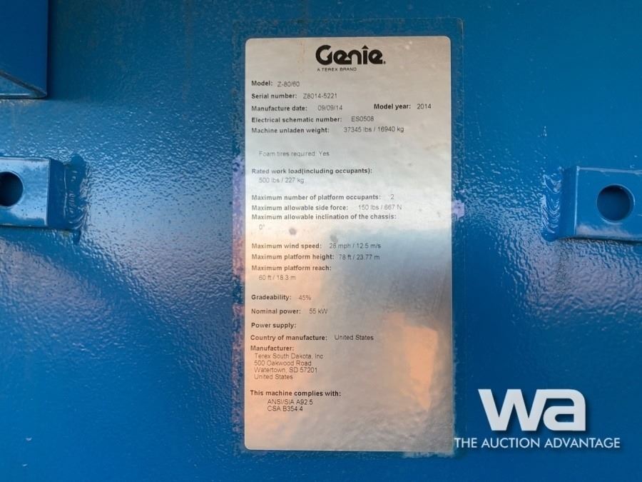 Meter: 5,391 HRS. DEUTZ 4 CYL. DSL. 74 HP ENGINE, HYD. ROTATION & LEVELLING, PWR. TO PLATFORM, 60 FT BOOM, 5 FT JIB SN: Z80145221