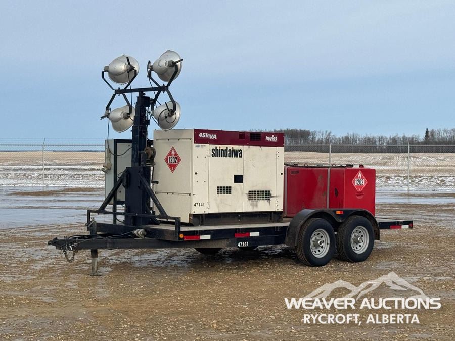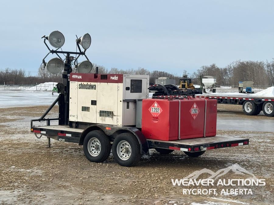 Specifications: UNIT# 47141 SHINDAIWA 45 KVA GENERATOR, 1,020L DIESEL TANK, 4 LIGHTS, ISUZU ENG. SN:D10701000748 5,200 LB AXLES