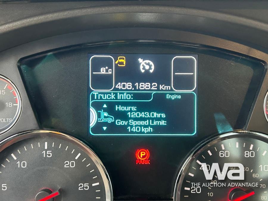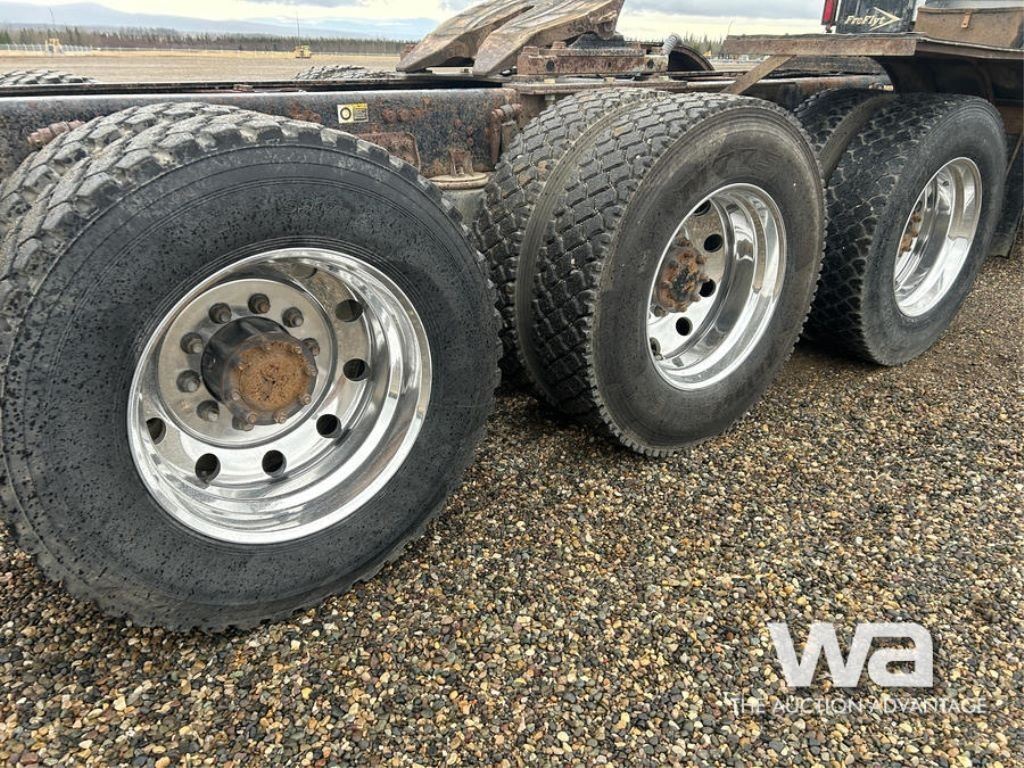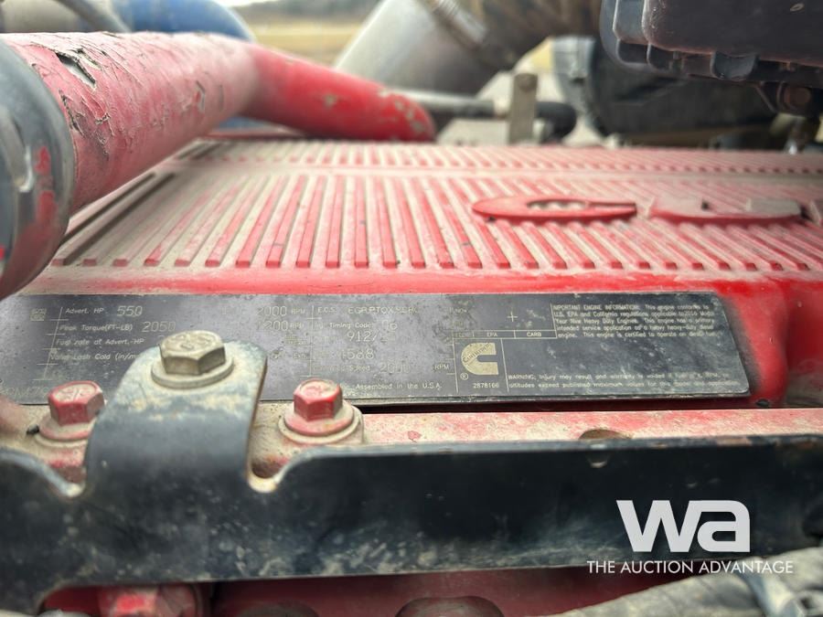 Specifications: UNIT # 1406, CUMMINS ISX15 6 CYLINDER DIESEL 550 HP ENGINE, ENGINE BRAKE, EATON FULLER RTLO-20918B 18-SPEED TRANSMISSION, TRIPLE DIFFERENTIAL LOCKS, 20000 LB FRONT AXLE, 65000 LB REARS, DANA T69-170HP DRIVE AXLES, 85000 LB GVWR, ALUMINUM WHEELS, 425/65R22.5 FRONT TIRES, 11R24.5 REAR TIRES, AIR RIDE SUSPENSION, DOUBLE FRAME