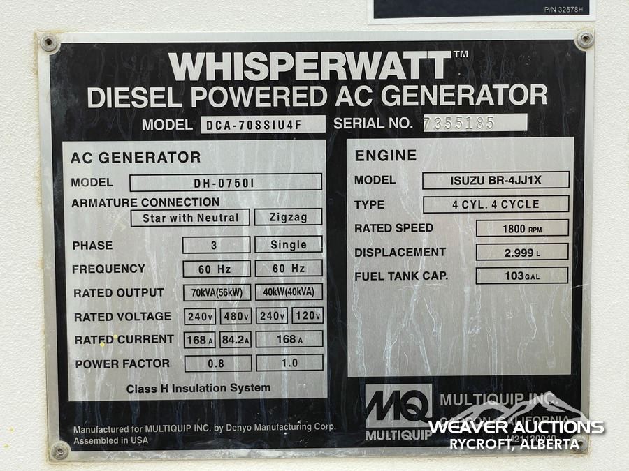Specifications: 2018 US EPA LABEL, ISUZU BR-4JJ1X 4 CYLINDER 71KW 2.9L DIESEL ENGINE, 70KVA/56KW RATED 3 PHASE OUTPUT, 240V/480V RATED VOLTAGE, LUNETTE RING CARRIER TRAILER, ENGINE STARTS & GENERATOR PRODUCES ELECTRICITY