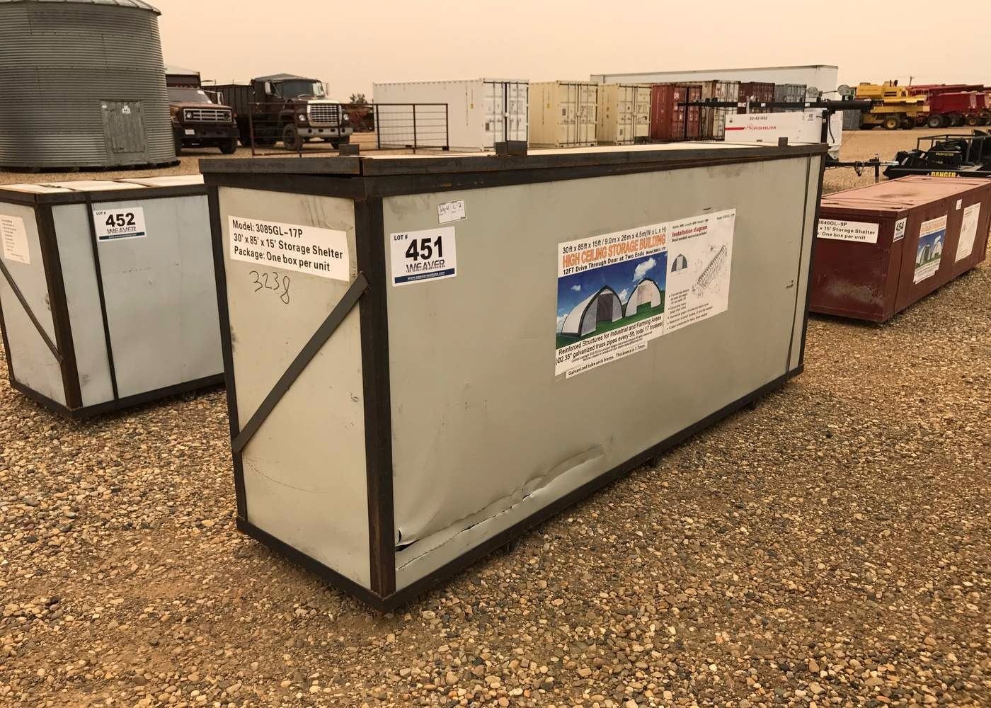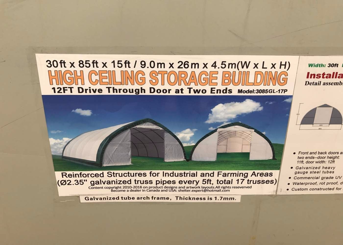 C/W: COMMERCIAL FABRIC, WATERPROOF, UV AND FIRE RESISTANT, 12 X 12 FT. DRIVE THROUGH DOORS AT TWO ENDS