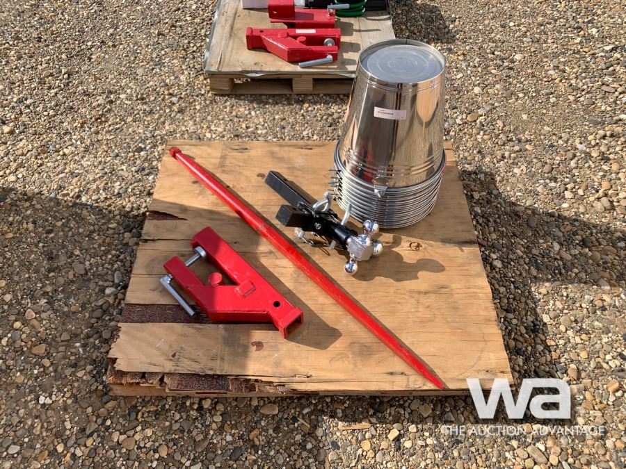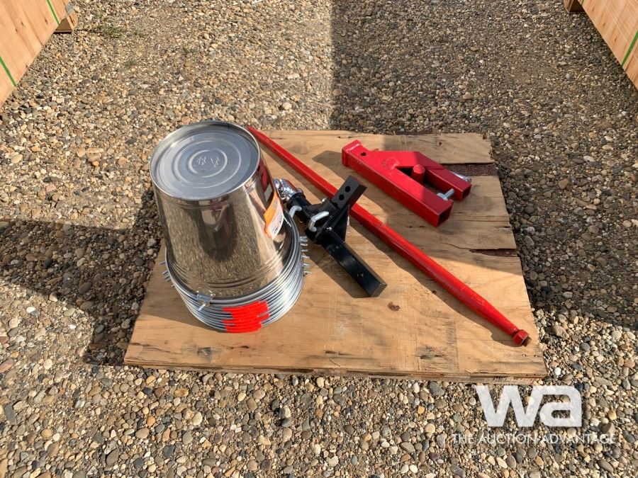 (10) STAINLESS MILK BUCKETS, CLAMP ON BUCKET HITCH RECIEVER, TRI SWIVEL 3 BALL HITCH RECIEVER, (5) RATCHET BOOMERS