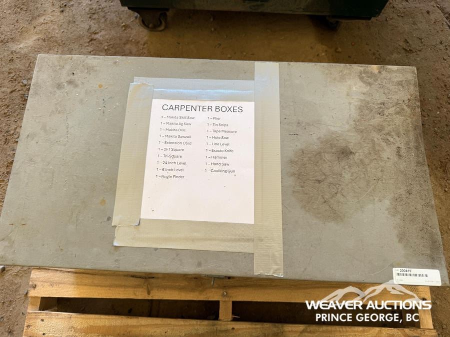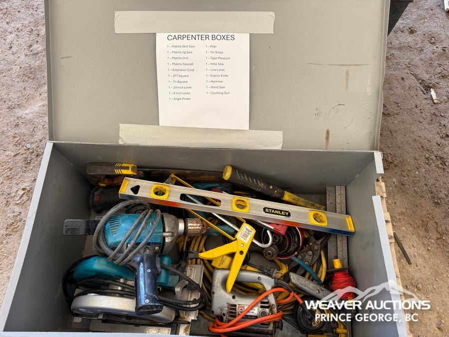 Specifications: MAKITA SKILL SAW, MAKITA JIG SAW, MAKITA DRILL, MAKITA SAWZALL, EXTENSTION CORD, 2 FT. SQUARE, TRI SQUARE, 6 AND 12 IN. LEVEL, ANGLE FINDER, PLIERS, TINS SNIPS, TAPE MEASURE, HOLE SAW KIT, LINE LEVEL, HAMMER, HAND SAW