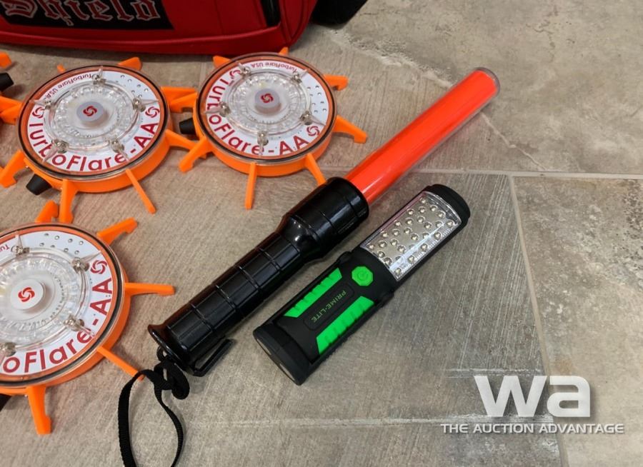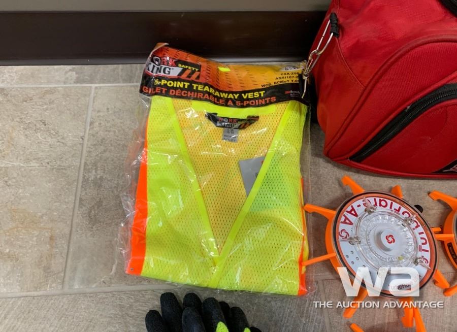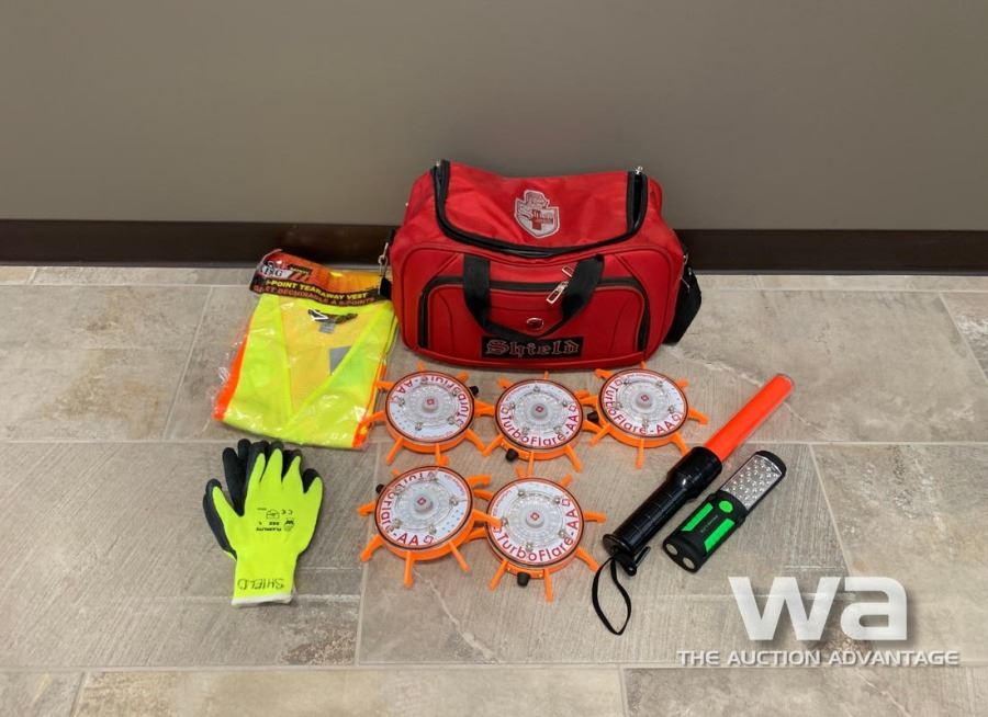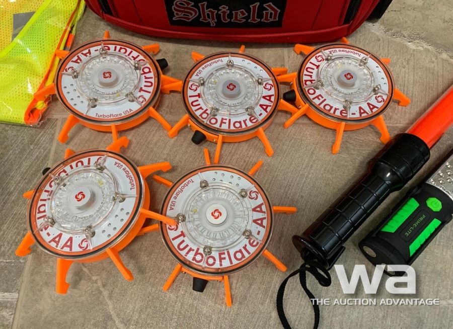 5 POINT VEST, (5) TURBO FLARE EMERGENCY BEACONS, (1) HAND BATON, FLASHLIGHT, SAFETY GOGGLES, GLOVES