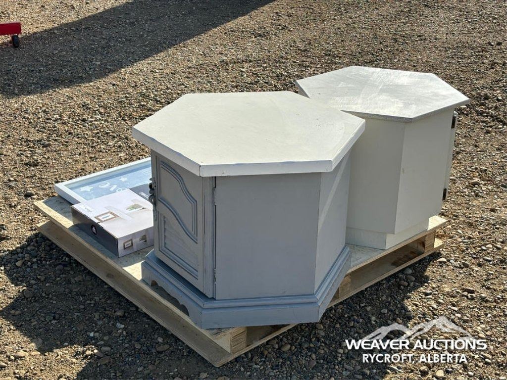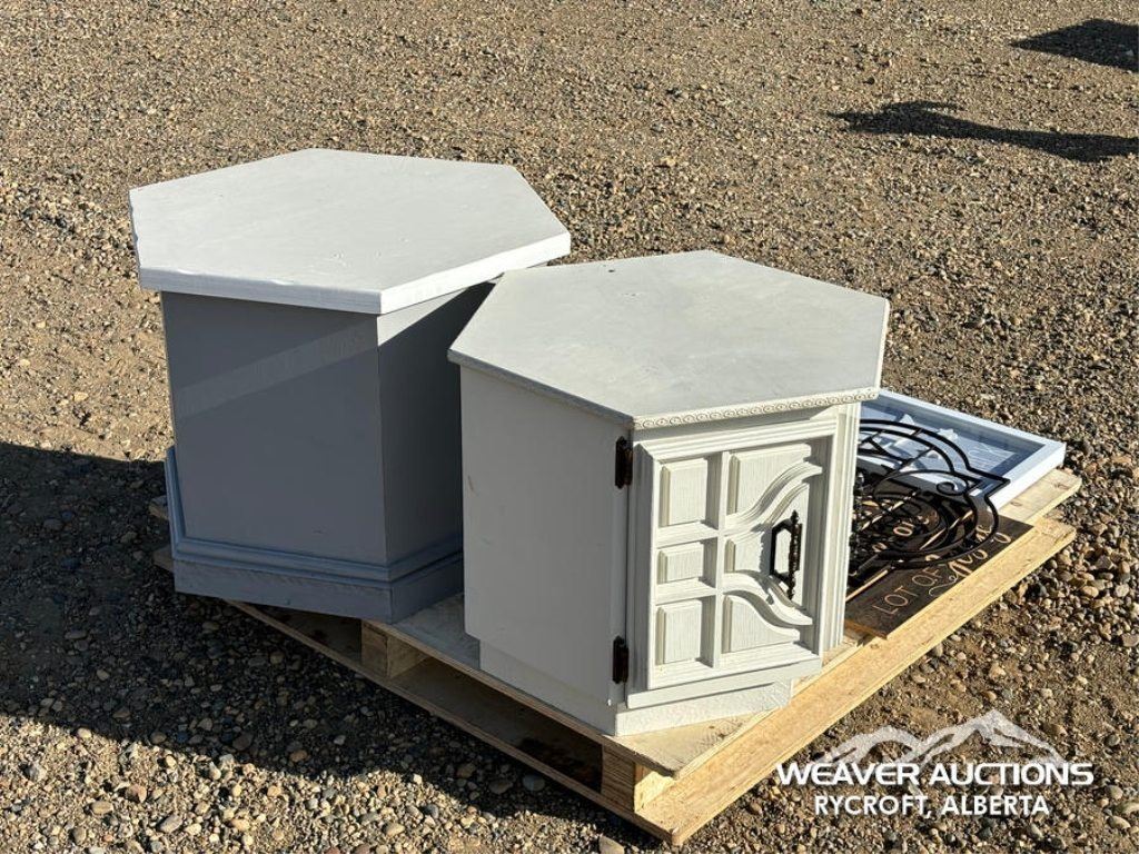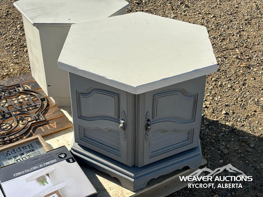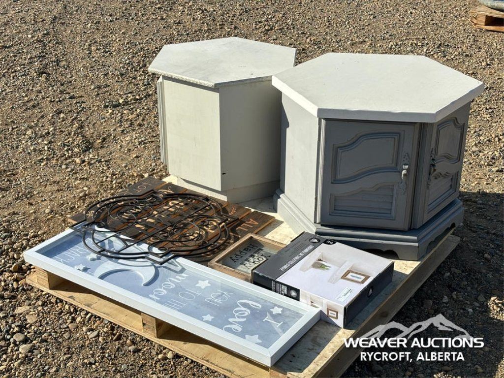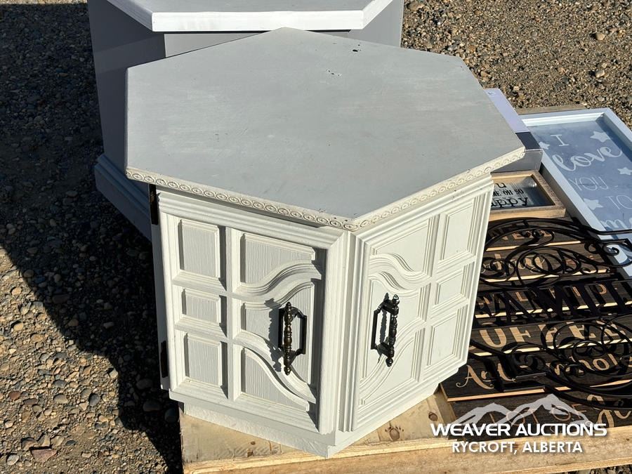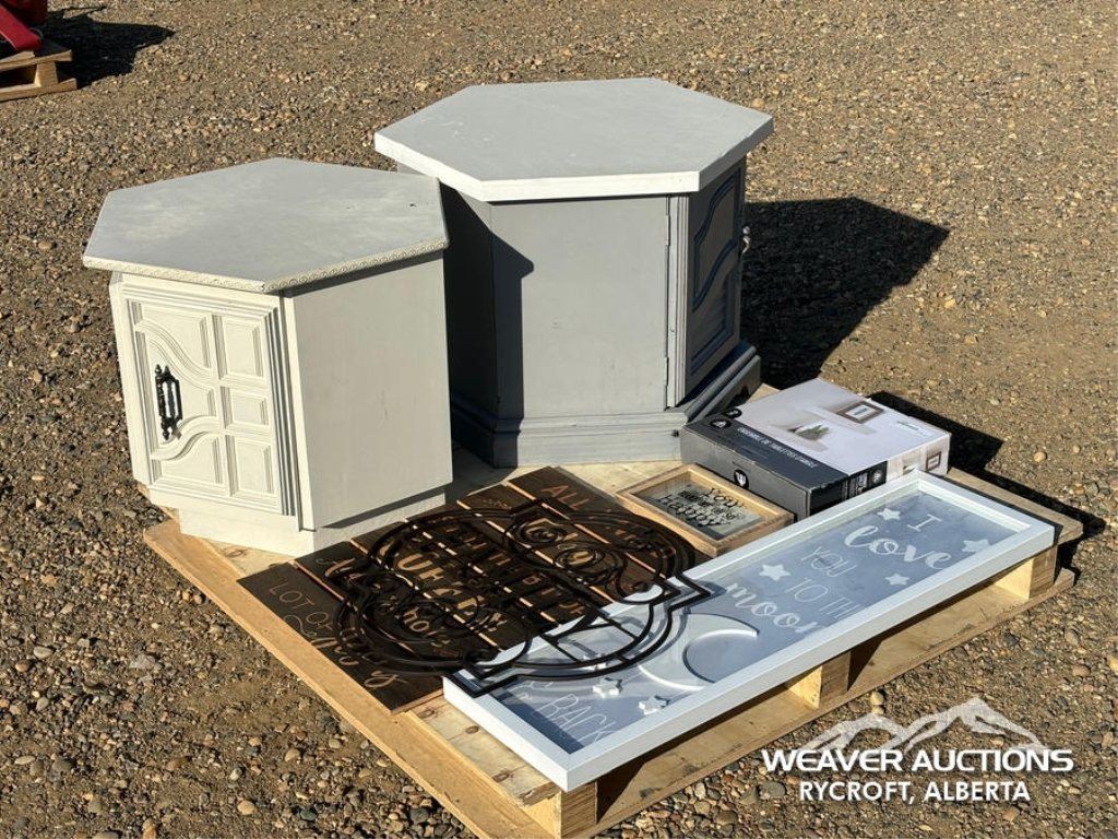 Specifications: (2) SIDE TABLES, CORNER SHELF, ASSORTED SIGNS
