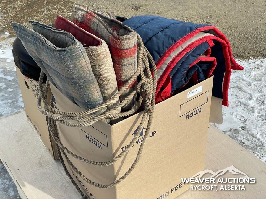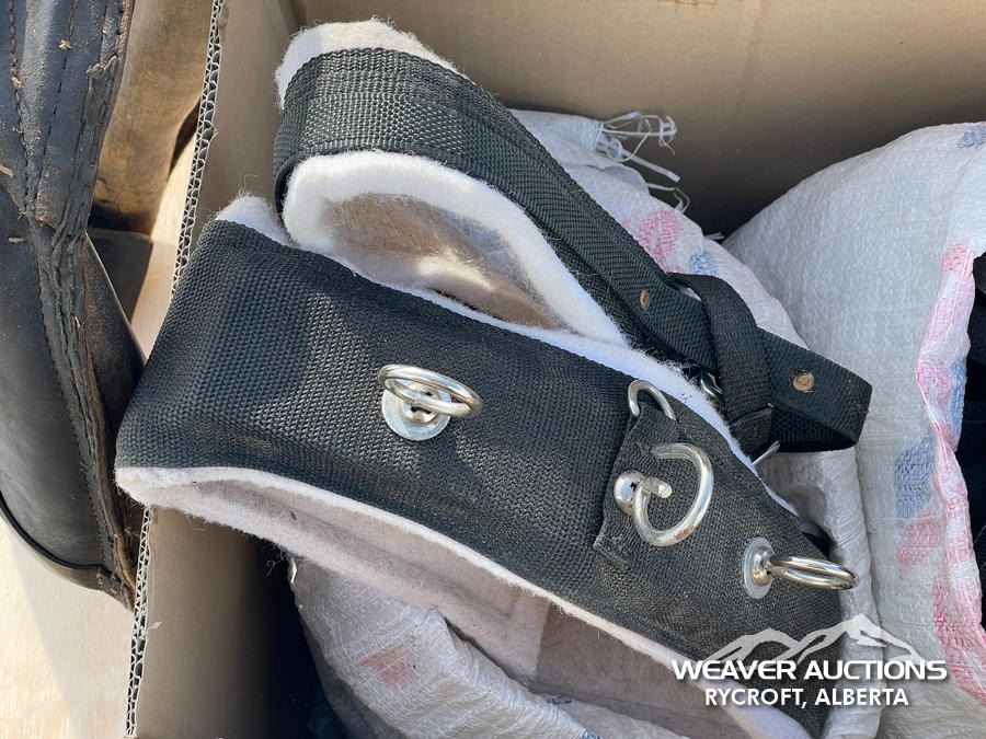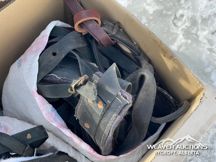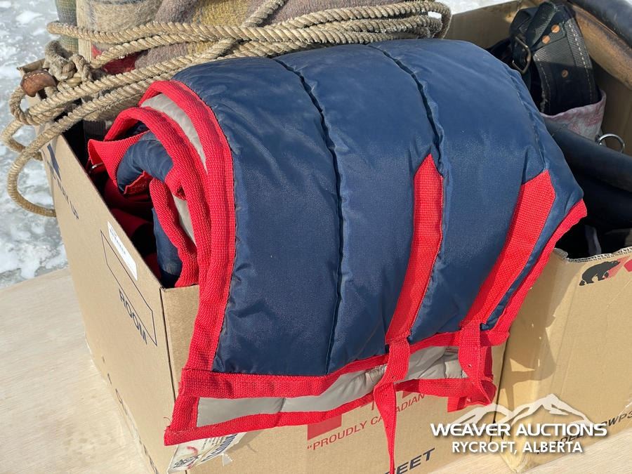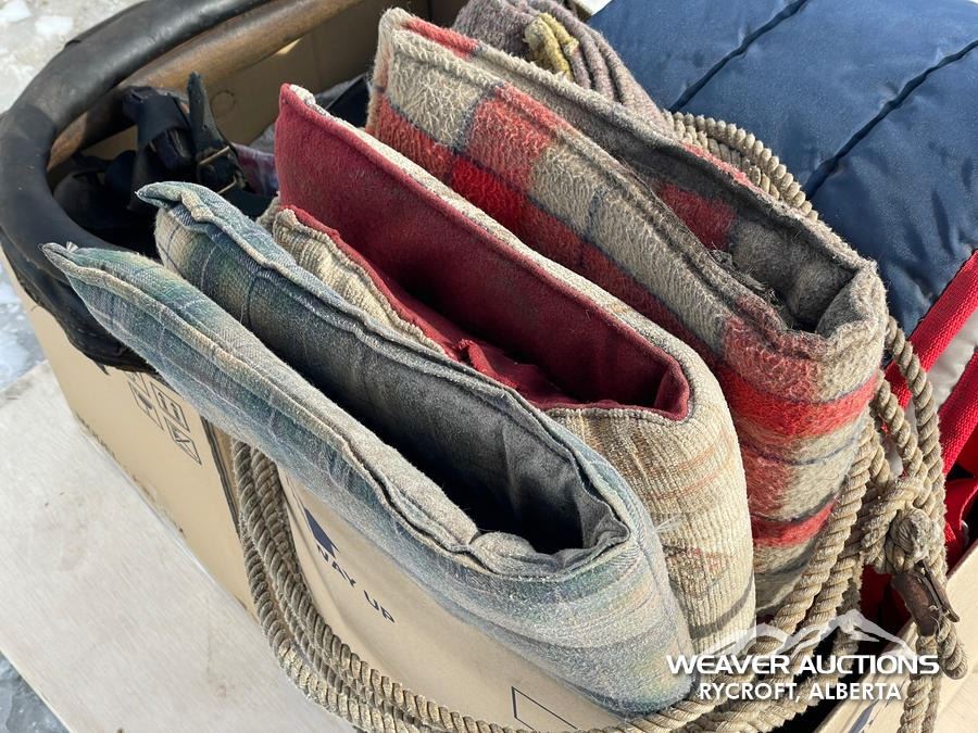 Specifications: (1) CANVAS & WOOL WARMING BLANKET, (1) NYLON WARMING BLANKET, (1) LEATHER SINGLE HORSE DRIVING HARNESS, (1) CANVAS SINGLE HORSE DRIVING CANVAS, (1) LEATHER COLLAR, (1) LARRIAT, (1) SADDLE BLANKET, (3) SADDLE PADS