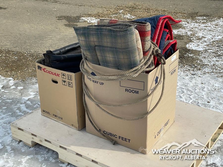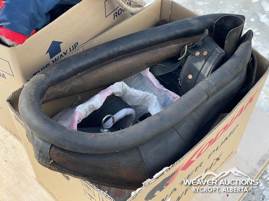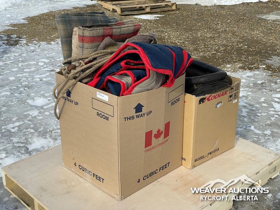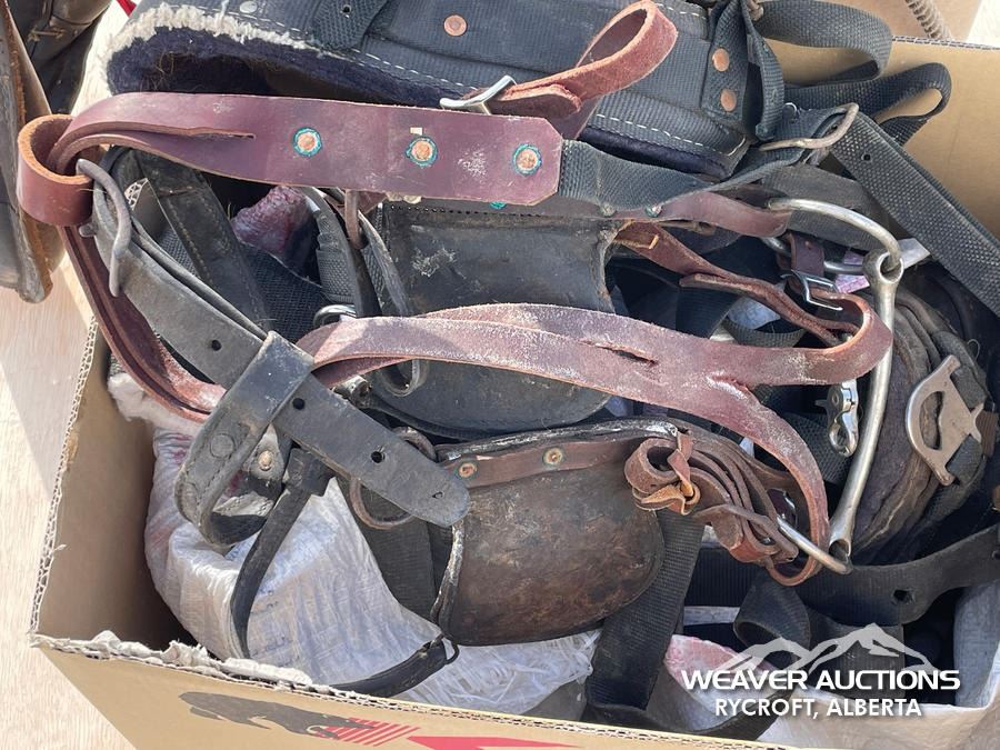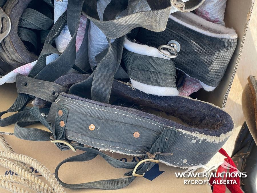 Specifications: (1) CANVAS & WOOL WARMING BLANKET, (1) NYLON WARMING BLANKET, (1) LEATHER SINGLE HORSE DRIVING HARNESS, (1) CANVAS SINGLE HORSE DRIVING CANVAS, (1) LEATHER COLLAR, (1) LARRIAT, (1) SADDLE BLANKET, (3) SADDLE PADS