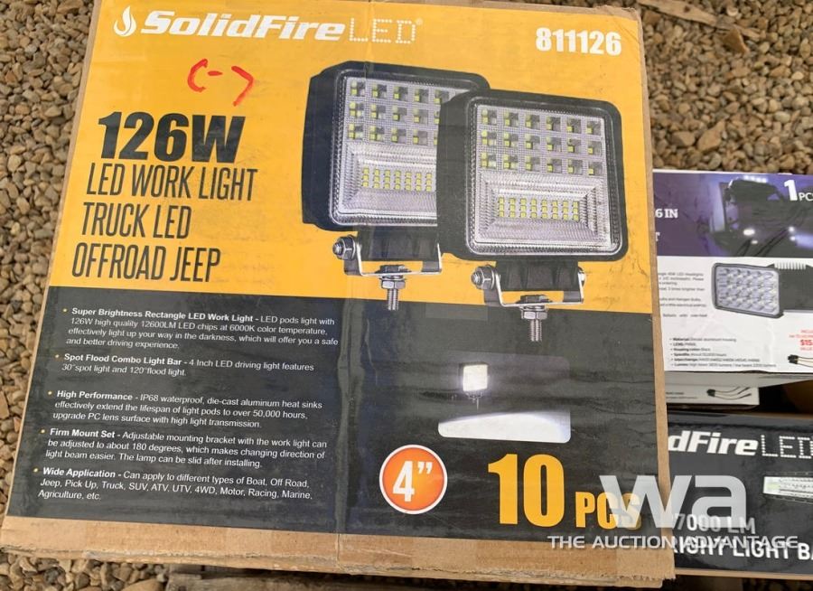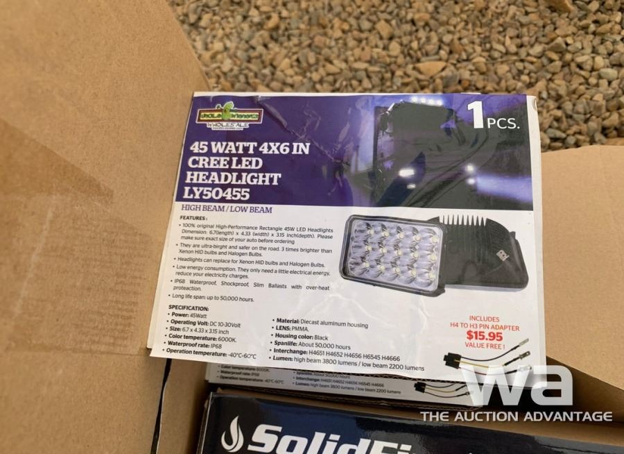 (2) 10 PIECE 4" 126W SOLIDFIRE LED WORK LIGHTS, (2) 45 WATT 4X6" CREE LED HEADLIGHT, (1) VEHICLE PLUG IN SPOTLIGHT