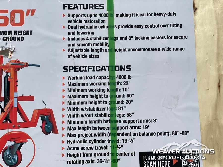 Specifications: *UNUSED, 22 FT. MAXIMUM WORKING LENGTH, 4 STABILIZER LEGS, 8 IN. LOCKING CASTERS, DUAL HYDRAULIC CYLINDERS