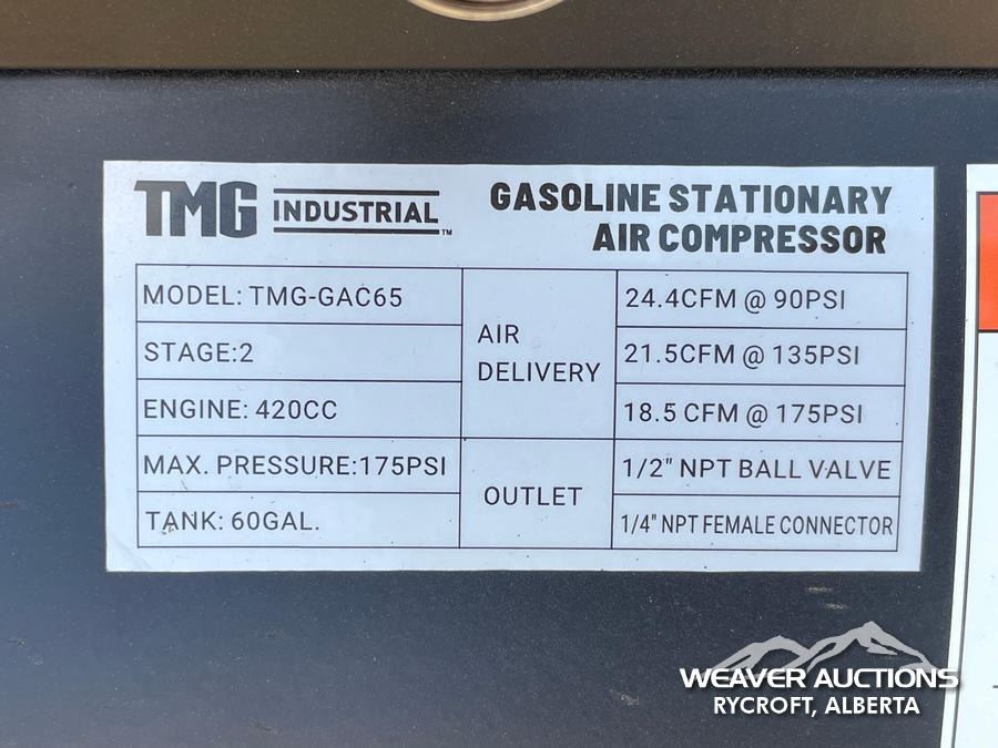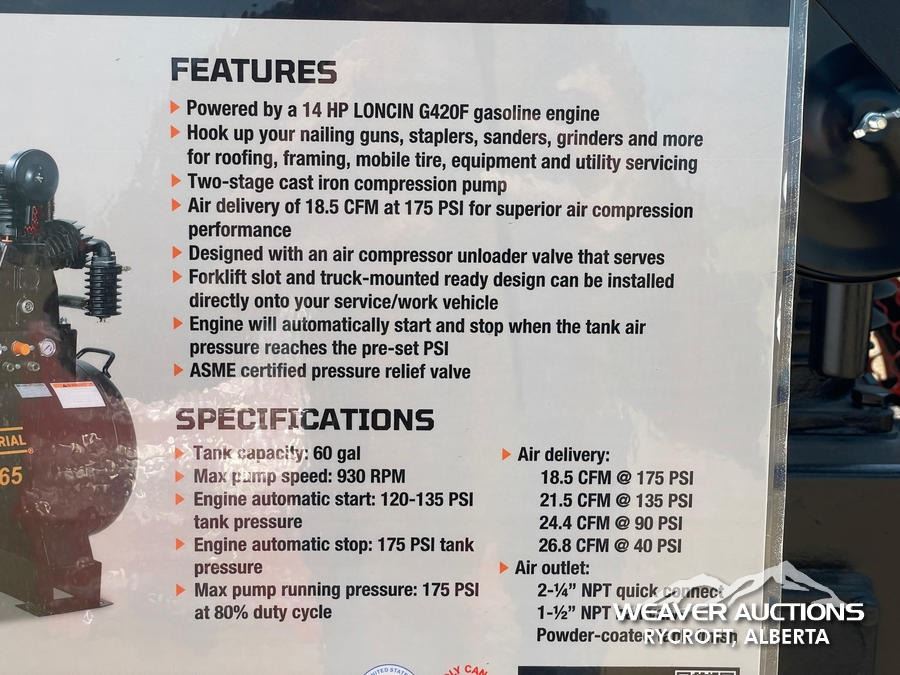 Specifications: *UNUSED, 930 RPM MAX PUMP SPEED, 175 PSI, TWO STAGE CAST IRON COMPRESSION PUMP, 14 HP LONCIN ENGINE