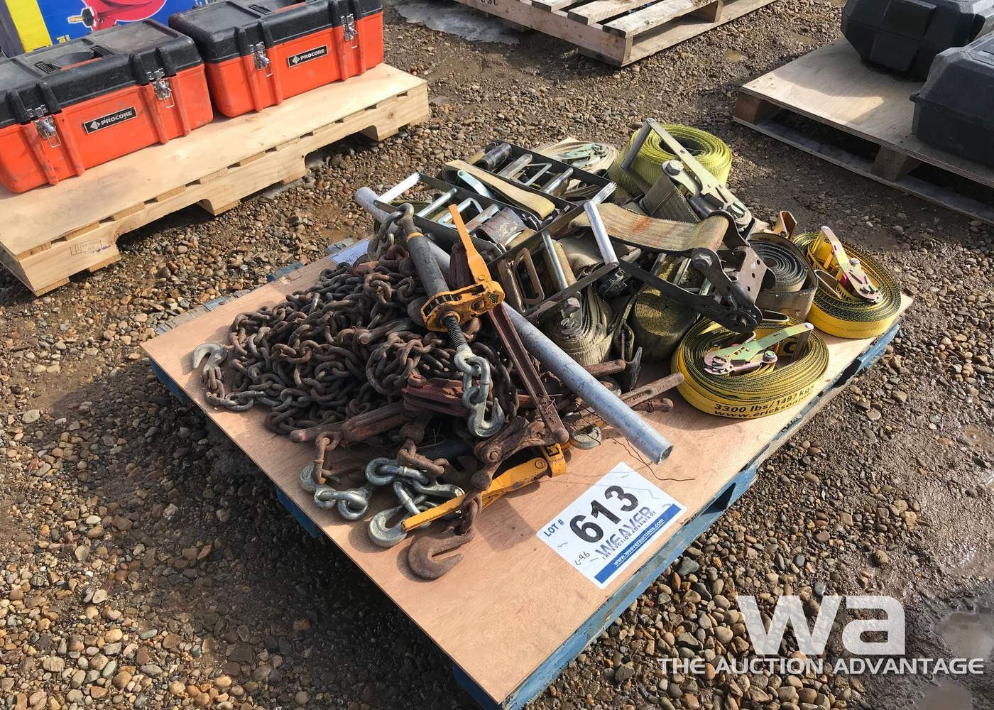 PALLET OF STRAPS, BOOMERS, & CHAINS